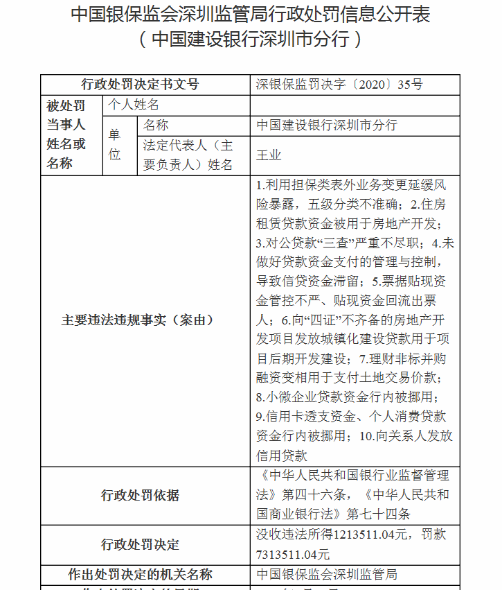 按照行政处罚决定,对建设银行深圳分行没收违法所得1213511.04元,罚款7313511.04元。